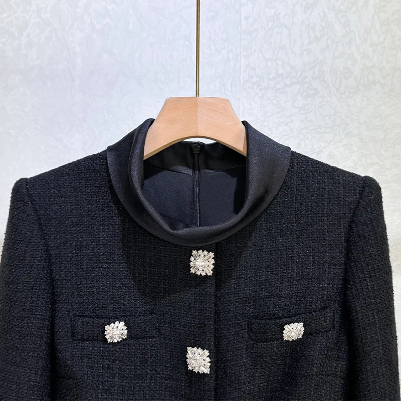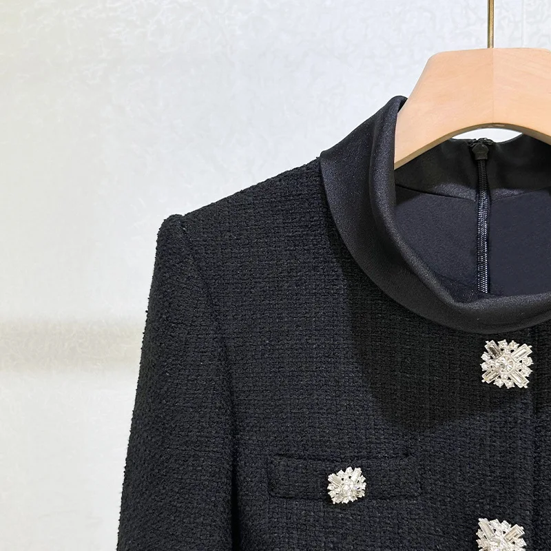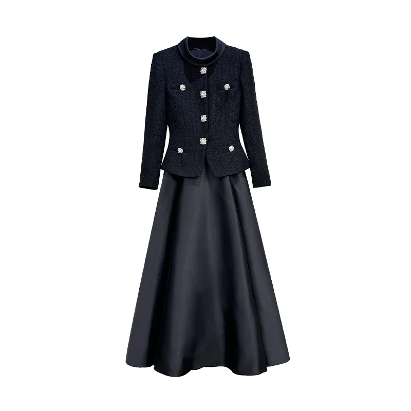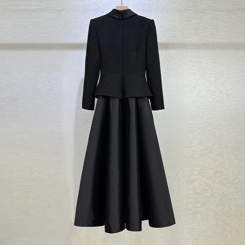 Factory Wholesale Autumn Winter Office Ladies Dress Women Chic Party Wear Black Tweed-Mesh Satin Patchwork High-Waist Dress